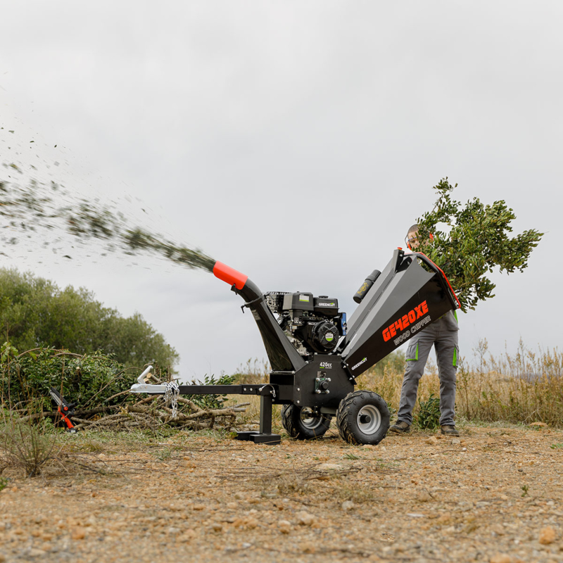La biotrituradora GE420XE es recomendada para jardines grandes, huertos, fincas o uso semi-profesional donde se manejan ramas de gran diámetro o grandes volúmenes de residuos orgánicos.